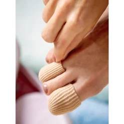 Stretchable cotton elastic protectors keep toes from rubbing against shoes, sandal, and each other, while the vitamin-enriched gel provides cool relief to corns, ingrown nails, blisters, and calluses. Set of four 2.5″ tubes fit any toe; cut to desired length. Hand wash, air dry. Imported.